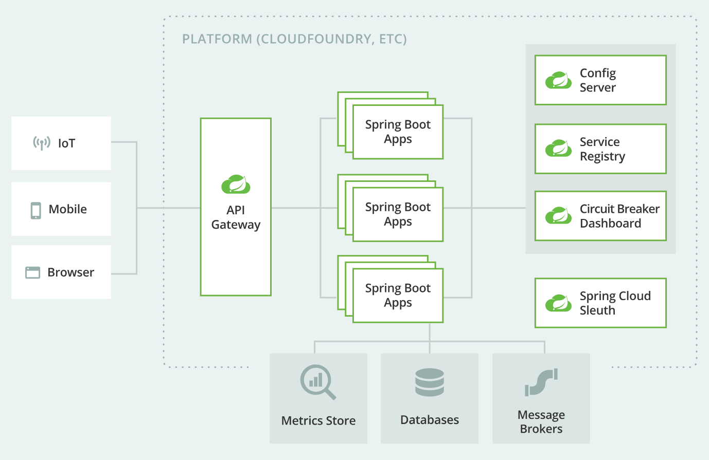 Habitualmente un setup mínimo de microservicios suele incluir varias aplicaciones Spring Boot con starters de Spring Cloud:
