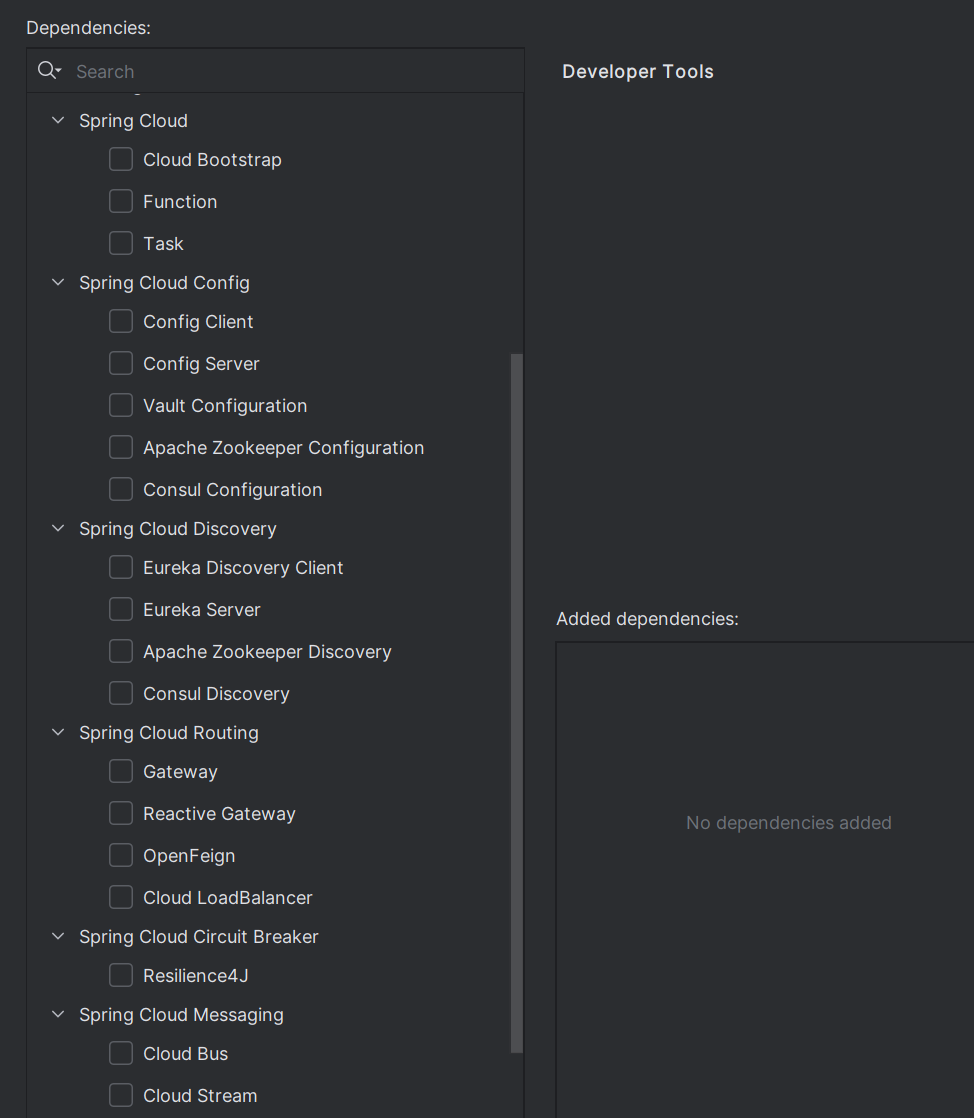 A la hora de crear un proyecto con Spring Cloud, ya sea desde start.spring.io o desde el propio IntelliJ IDEA Ultimate, podemos ver que la lista de starters es extensa y proporcionan diferentes capabilities: