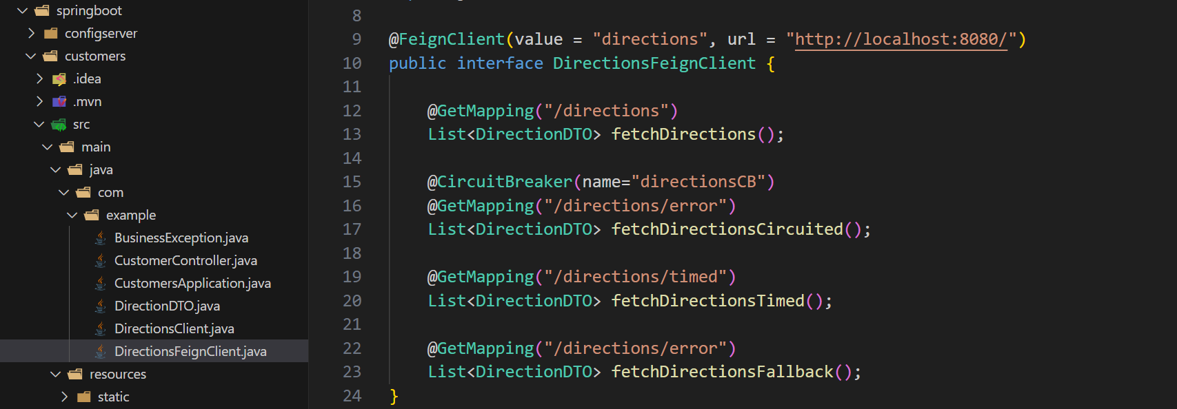 Por ejemplo, si tenemos un microservicio llamado customers, que tiene que comunicarse con un microservicio llamado directions, este podría ser el archivo de configuración: