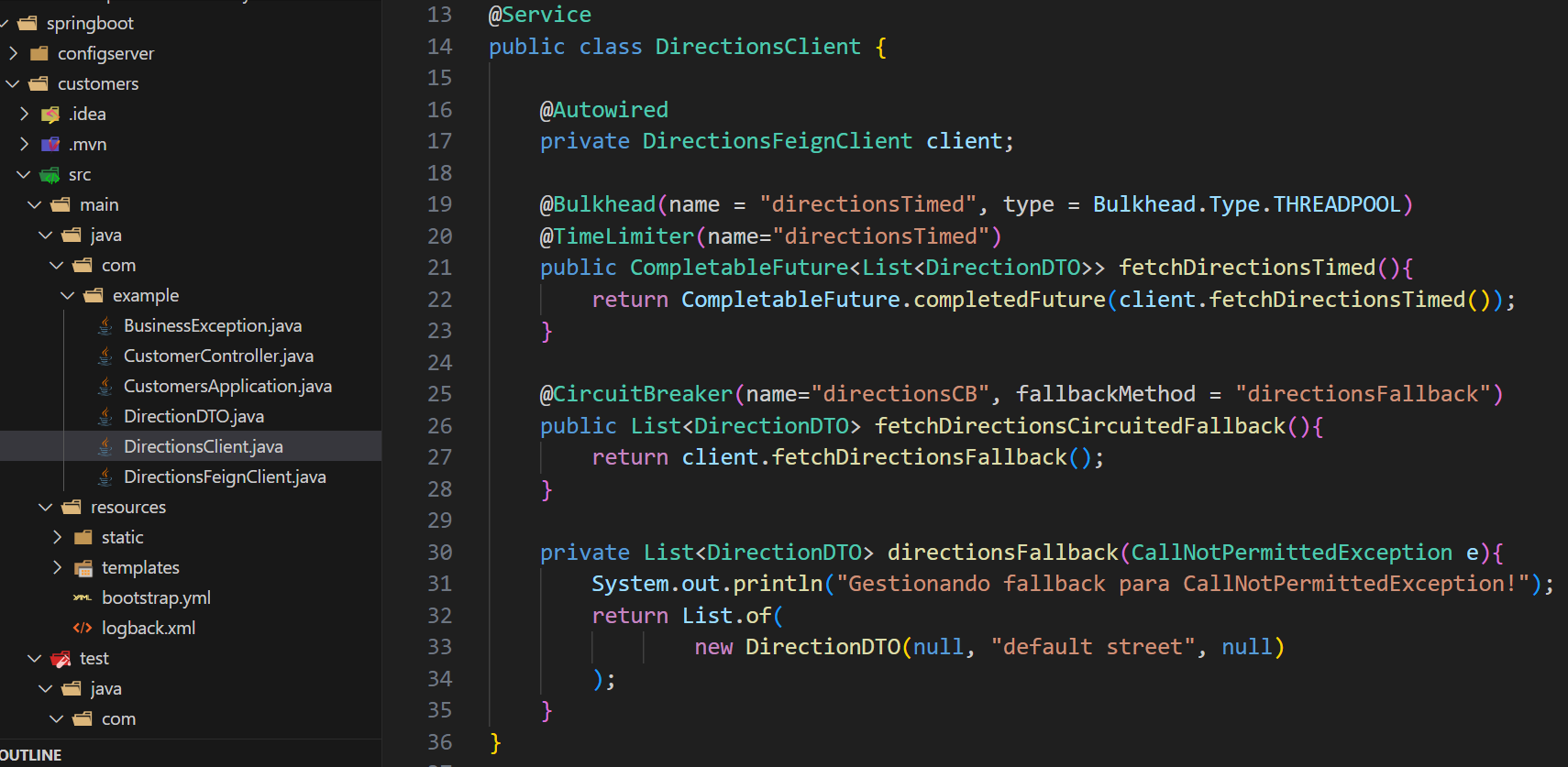 La forma más sencilla de aplicar el circuit breaker es mediante la anotación @CircuitBreaker: