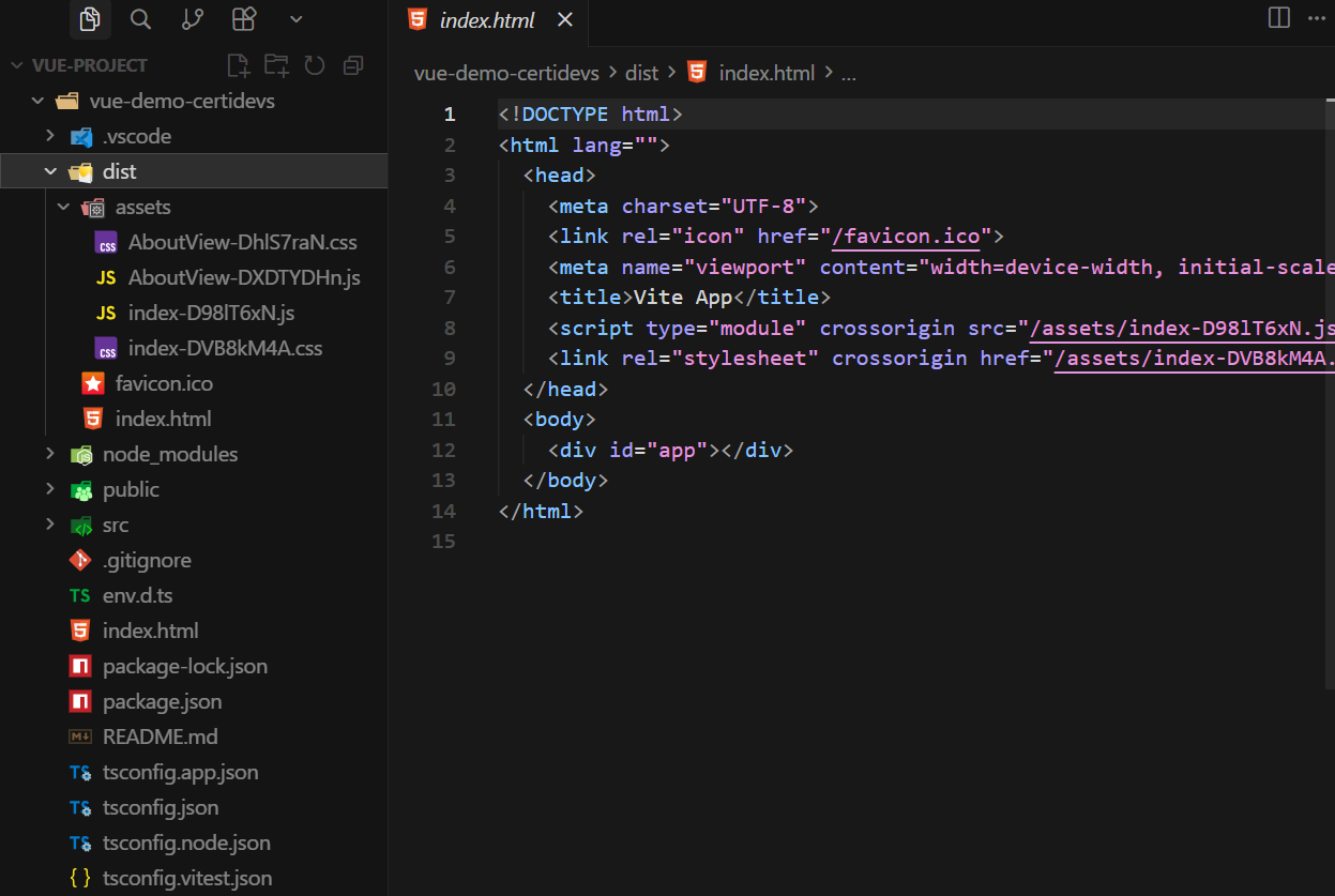 outDir: directorio donde se genera el build. Por defecto esdistminify:'esbuild'es más rápido,'terser'produce bundles ligeramente más pequeñossourcemap:truegenera sourcemaps públicos,'hidden'los genera pero no los referencia desde los archivos JS (útil para error tracking sin exponer el código fuente)target: define el target de JavaScript para la transpilación.'es2020'es adecuado para navegadores modernoscssCodeSplit: cuando estrue, el CSS de cada chunk se extrae en un archivo separado