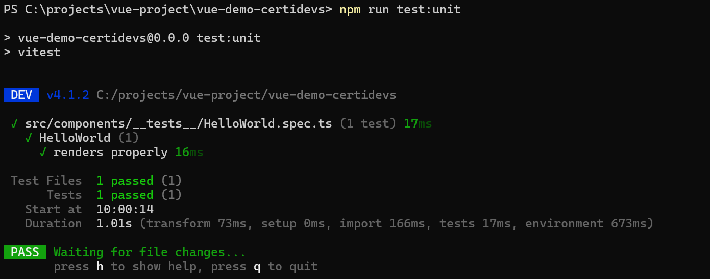 Ejemplo de salida al ejecutar el script npm run test:unit en un proyecto Vue con Vitest configurado (puede mostrarse como vitest run según tu package.json):
